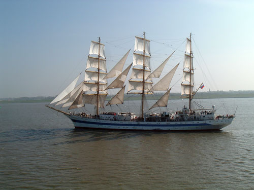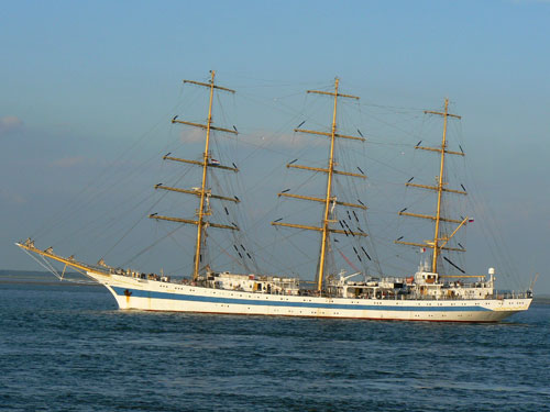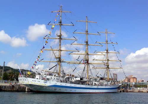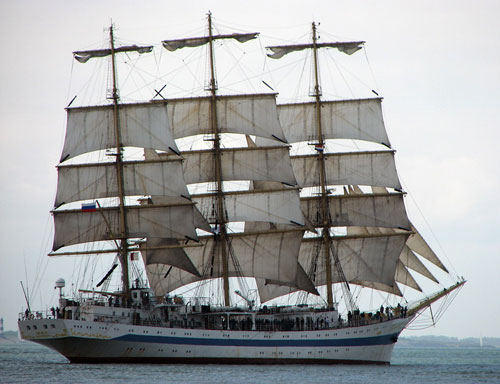 俄罗斯海军“和平”号风帆训练舰于1987年在波兰格但斯克建成,共同六艘同型舰,“和平”号为第三艘。该舰为全帆装型,长109.2米,宽13.9米,高52米,吃水6.3米,满载排水量为2771吨。该舰为风帆和柴油机混合动力,据称最高航速高达19节(风帆状态),曾被称为世界上最快的风帆军舰。该舰舰员在70-144人之间,最大载员199人。该舰母港为彼得堡,该舰一直为俄罗斯海军执行学员训练任务,经常访问包括英国、美国在内的西方国家。