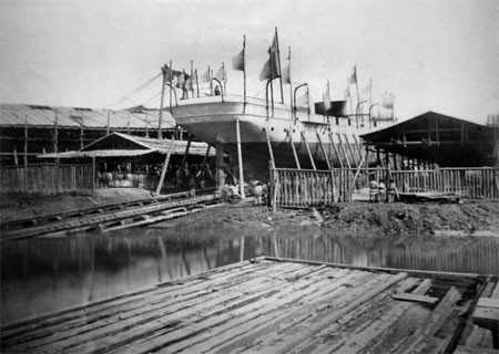 6月10日,模样初具的第一号轮船旁人头攒动。先期一日,原本在第一号轮船身下的船台枕木被撤掉,代之以木楔,此刻船体低俯在木楔胎架上,两舷被十余根撑柱抵住,铜皮包裹的船底外厚厚地涂抹着猪油、牛油、肥皂。船政大臣沈葆桢率提调周开锡等船政官员祭祀了妈祖、江神、土神、船神后,中午时分,在洋员总监督日意格指挥下,工匠们依序撤除船舷外的木撑,敲出船底剩余的木楔,天蓝色涂装的第一号轮船乘势划向江面。。。。。。“一瞬之间离岸数十丈,船上人乘势下碇,抛泊江心,万斛艨艟,自陆入水,微波不溅,江安无声,中外欢呼,诧为神助。”
