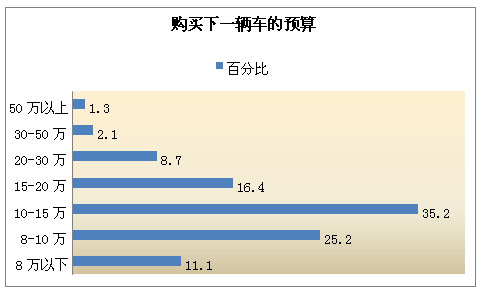 中年人购车预算较高,50岁之后,随年龄增大,购车预算降低。这一趋势与上次调查结果相似。但明显的差别在于,上次调查中,最高的购车预算集中在15至20万的价格区间,而此次数据显示,最高的购车预算集中在10至15万的价格区间。这与目前的经济形势相契合,可以说,受金融危机影响,人们的购车行为在日趋谨慎。