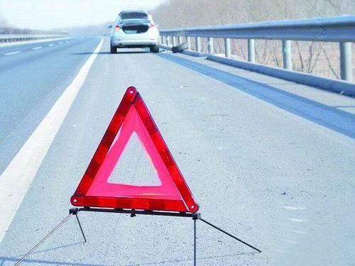 高速上爆胎后,更换轮胎时,一定要摆放上三角警示牌。