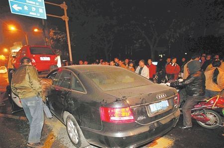 昨晚10时许记者赶到现场时,交警正在处理现场,一辆黑色奥迪车横摆在路中间,车头已经被撞得凹陷,旁边一辆红色QQ车的车尾更是被撞得面目全非。