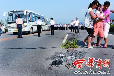 ![]() 昨日,情绪激动的死者家属砸裂大巴车窗,不准乘客下车。为防止发生意外,特警围在大巴四周保护