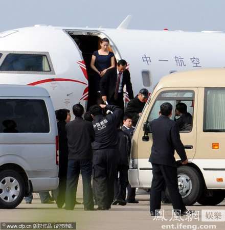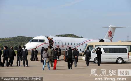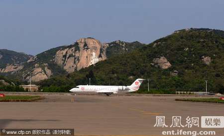 图注:飞机缓缓着陆 图注:引导员在引导飞机进入停机坪 图注:赵本山携小沈阳从“本山号”走下来
