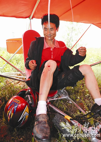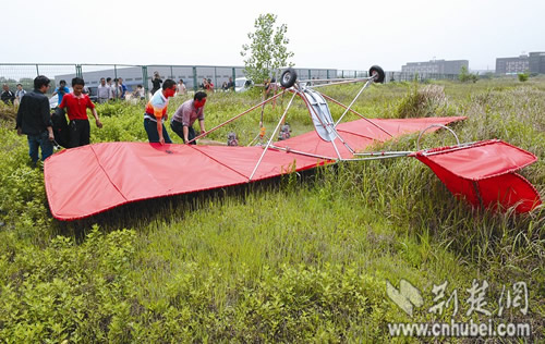 此时,所有人都奔到门外的草地,舒满胜已经从坠毁的飞机中爬出来。记者看到,飞机左右机翼的两部螺旋桨撞毁,机身的不锈钢管撞断,舒满胜小腿部有一些擦伤。舒满胜显然对试飞不太满意,称“效果不理想。”