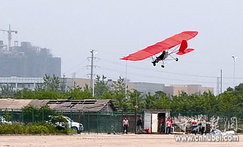 农民舒满胜自制飞机欲上天的事情,经本报10日6版报道后,引起各方关注。昨日上午,东湖高新技术开发区光谷大道关山物流货运中心,舒满胜几经波折,最终强行将飞机驶离地面,但最高飞离地面5米后坠落,舒满胜小腿受轻伤。