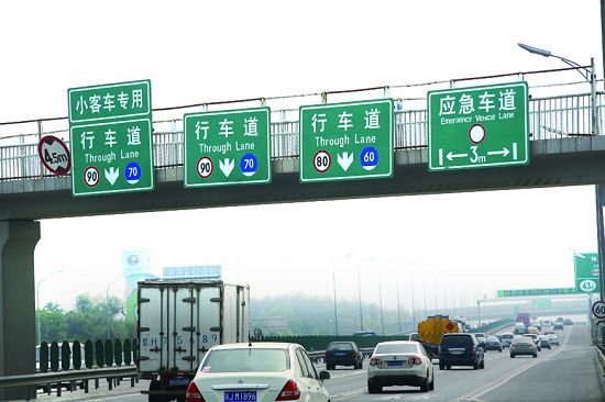 路上方的交通标志一般会布置在桥梁和横跨路面的横梁上,在高速公路上和邻近交叉路口时多见,多用于指路和车道指示。因此行车至路口前一定要注意观察前方视野上方的这些标志,按照指示驶入应该行驶的车道。而高速公路上方的标志很多是高速驾驶员前方将要到达的地名,并指明目前的距离和在哪个出口驶出,要根据这些指示着重留意目的地的出口信息。还有一些是指明每条车道的限速标准,比如最内侧车道通常限速120 km/h,中间车道限速100 km/h,最外侧车道限速80 km/h,驾驶员要按规定行驶。
