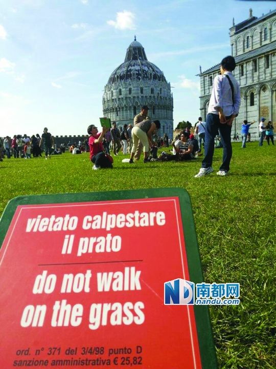 在比萨斜塔前面有一大片草坪,10月2日下午,虽然有明确标识不能践踏草坪,但不少来自各国的游客进入草坪以取得更好的拍照角度,其中以黄皮肤、说汉语的中国人为多。他们在草坪上或躺、或坐、或踢腿,摆出各种姿势拍照,更有人在草坪中间席地开餐,取出水果面包等大吃。