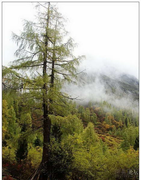 再往前走就只有泥泞的马道了,继续前行的人不多。我们租了防水的雨靴,深一脚浅一脚的跋涉。这也叫路啊,简直就是沼泽,林中的路就是被马踏出来的无数个蹄印,像一长遛杂乱排着的蜂窝煤。还是有些骑马的人,晃晃悠悠在林中穿行。那些穿旅游鞋甚至是皮鞋的游客就很惨了,只能顺着路边找有石头或是稍微干点的地方一步步跳着走。路虽然烂,但景色很美,真的是没有开发过的原始景观。林子很密,阳光透过树冠在地上撒下稀稀拉拉的斑点。一些树叶已经变色了,或金黄或火红,为这一片冷杉林多少点缀出些暖意。