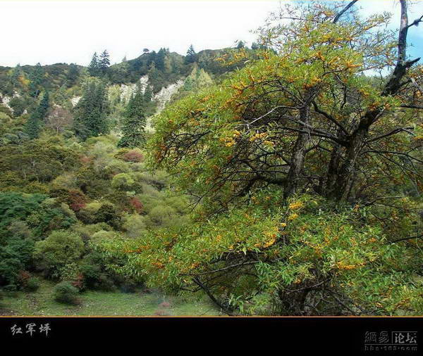 想不慢都不行了,一到夹金山路就窄了、烂了,车子又陡显出马力的疲软,真有些想换SUV的冲动。这条路车很少,不是什么黄金旅游线路,开起很沉闷,好半天才有车从对面开过来,大家都忍不住互鸣喇叭。转过几个山头,渐渐走势变缓,车子来到了一条漂亮的山谷。在一片草坪边停了4、5辆车,三三两两的游人正在这儿小憩。这儿有几座藏民的房子,路边摆起了羊肉野菌,烤得正欢。一打听,这儿是红军坪,真正的夹金山还没有开始翻呢。红军坪的景色很不错,比双桥沟中命名的几个点好看多了,据说是当年红军翻过雪山后修整的地方。草坪、森林、溪流、水洼、野花、红叶、群山……各色景致在这一片不大的山谷中密集绽放。山风起处,草丛如波涛翻涌,红叶黄叶四下飘舞。不须走,站在原地环顾一圈,就能有四季交替的感觉,真是别样的高山湿地美景。