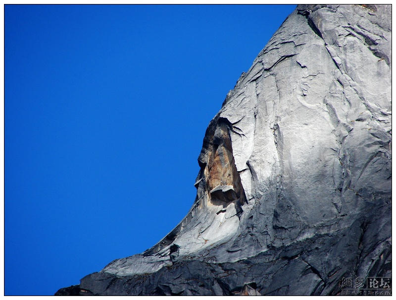栈道很好走,用一米五的木板整齐地铺设,每50米还有里程标识。游人多是进沟的,三三两两边走边停。沿途的景色其实一般,我们背着不大的行囊,在人缝中穿插,一路数着地上的里程,脚步更加轻快。忽然前边传来一阵惊呼,抬头望去,四姑娘山雪峰屹然眼前。这应该是大姑娘吧,山顶上白雪皑皑,在蓝色的天际间显得格外醒目。游人些都忙着拍照,几群人混在一起摆着姿势,把桥头堵得满堂堂的。