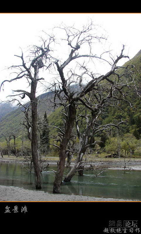 盆景滩却是另外一种风光。滩头地势很平,盐白的石英砂被冲积成漂亮的波纹。溪水在这儿舒展开来,静静流淌。因为慢,就像一汪泛不起波澜的潭水。水中,立着几棵枯去的沙枣,宛如不朽的胡杨,枝干婆娑,怒指天穹。云层在不断的变化着姿势,水影中偶尔能显出一方蓝天,树影水影光影,相互应衬,苍凉而凄美。