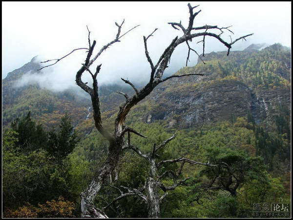 继续前行,视野逐渐开阔,倒不是因为林子稀了,而是到了一个大的滩头。这儿是栈道的尽头——枯树滩。水很浅,但流得很急,溪水中是几块露出的滩头小岛。岛上和浅水中,立着几株枯树,高大挺直,像是死去的雪杉。摊贩、马队都在这儿聚积,各自吆喝着自己的生意。游人铺散开来,或骑马穿林,或品味烧烤。更多的,是踩着跨在溪中的横木到岛上去戏水、拍照。