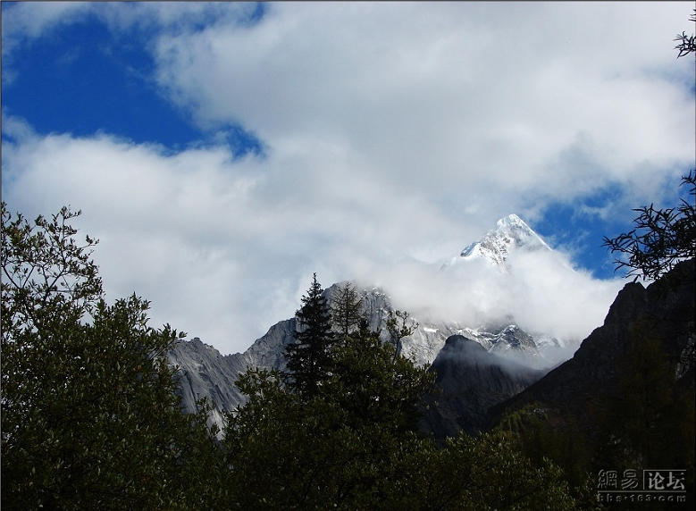 走出林子,就是山脚下了。视野前移,四姑娘山主峰赫然就在眼前。壮哉!美哉!难怪有东方阿尔卑斯山的美誉。想想这样的画面,一条小溪蜿蜒绕过,在阳光下泛起一片银色。溪边芳草萋萋,野花丛丛。然后是高高低低的各色灌木,相映成趣。后边是冷杉红杉排列的屏障,重重叠叠簇拥着巍峨的山体。上边是终年不化的冰川,晶莹剔透,遇风旗云。山体也不单一的赭色岩石,被阳光彩绘成了一座梦幻般的金字塔……