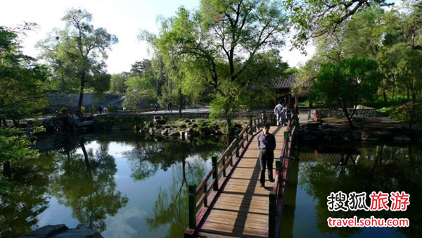 中线:下万壑松风蹬道至如意湖、下湖中间的拱桥,是中线的起点。经芝径云堤,到采菱渡,如意洲,到达中线结景青莲岛(烟雨楼)。